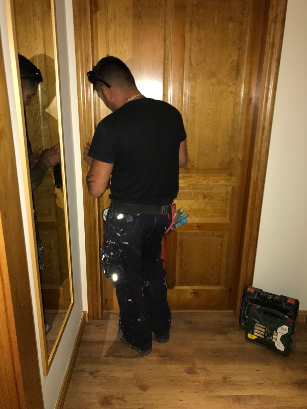Llama a recepción y sobre las 23.00 horas, cuando ya tendríamos que estar en la cama, el carpintero arreglando la puerta. Que situación, pero menos mal que vino, porque a Chan se le había roto el casco, y con la cinta aislante que le dio el carpintero lo arregló.